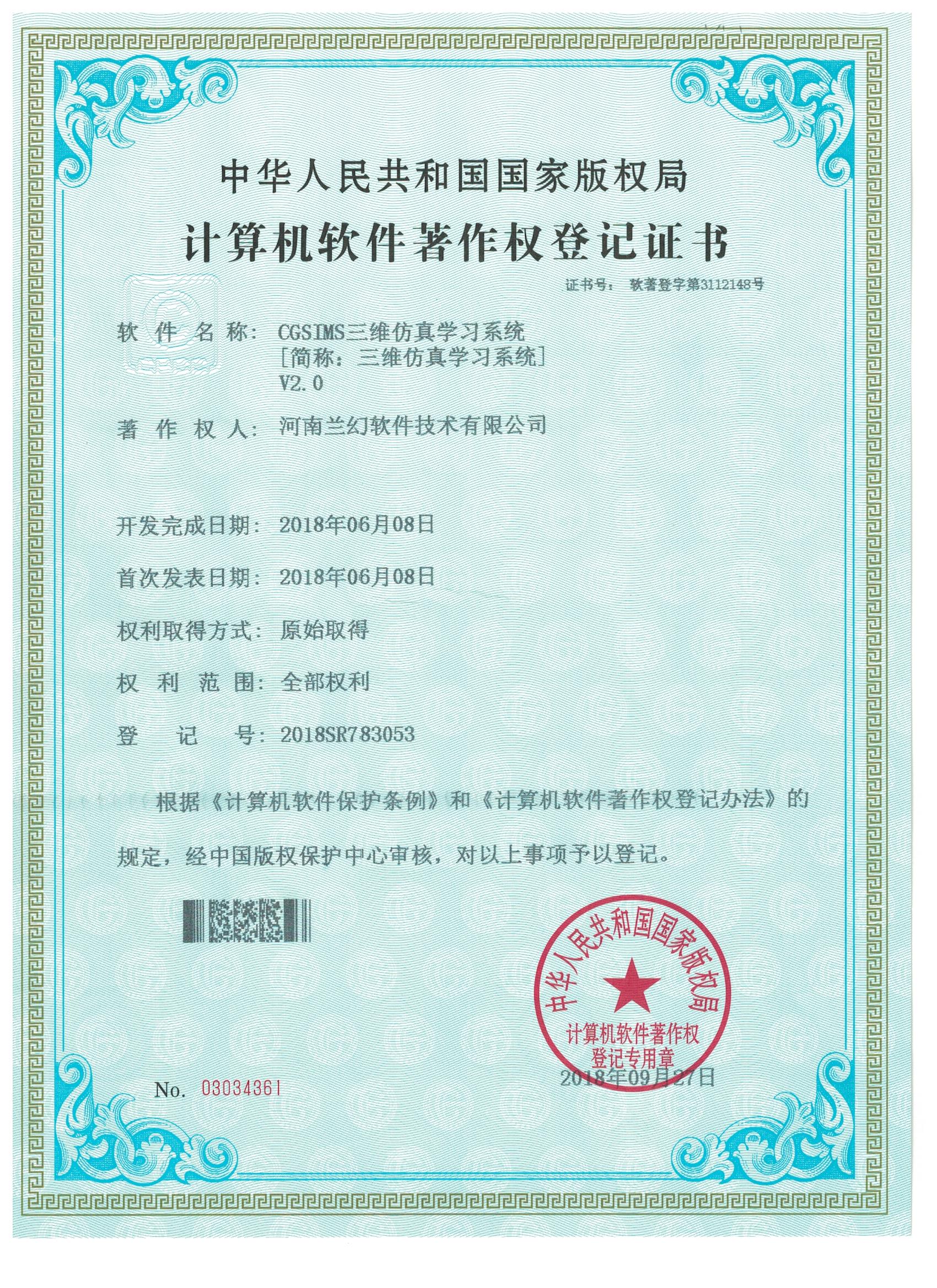 化工實(shí)訓(xùn)仿真著作權(quán)證書                 CGSIMS-三維仿真學(xué)習(xí)系統(tǒng)著作權(quán)證書             區(qū)域網(wǎng)絡(luò)血壓管理系統(tǒng)著作權(quán)證書
