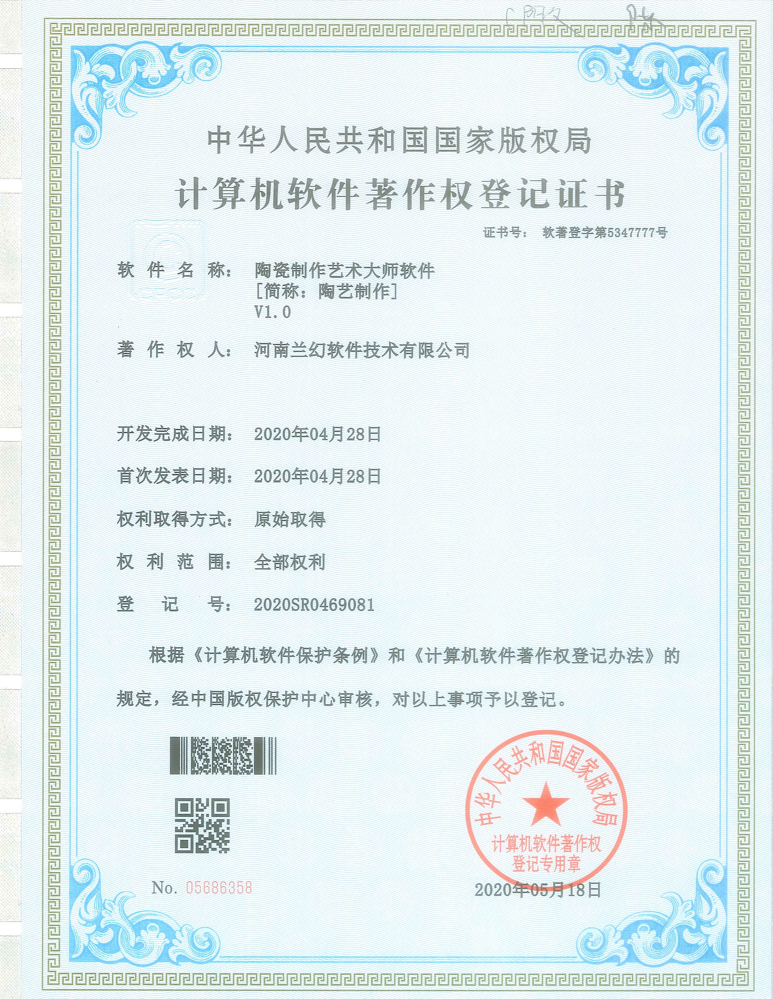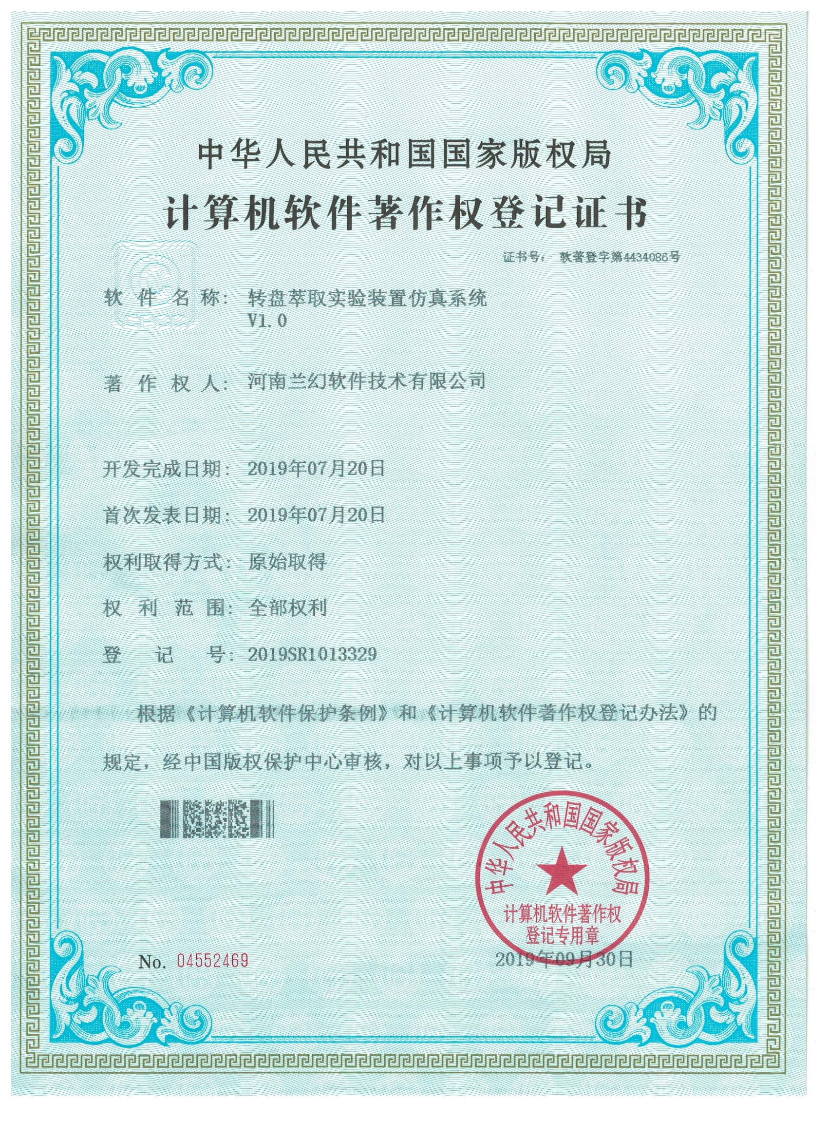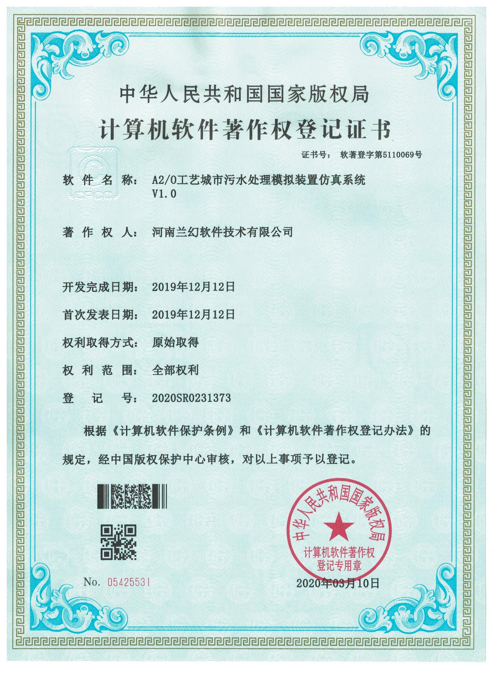 A2/0工藝城市污水處理模擬裝置仿真系統(tǒng)     轉(zhuǎn)盤萃取實(shí)驗(yàn)裝置仿真系統(tǒng)著作權(quán)證書          陶瓷制作藝術(shù)大師軟件著作權(quán)證書