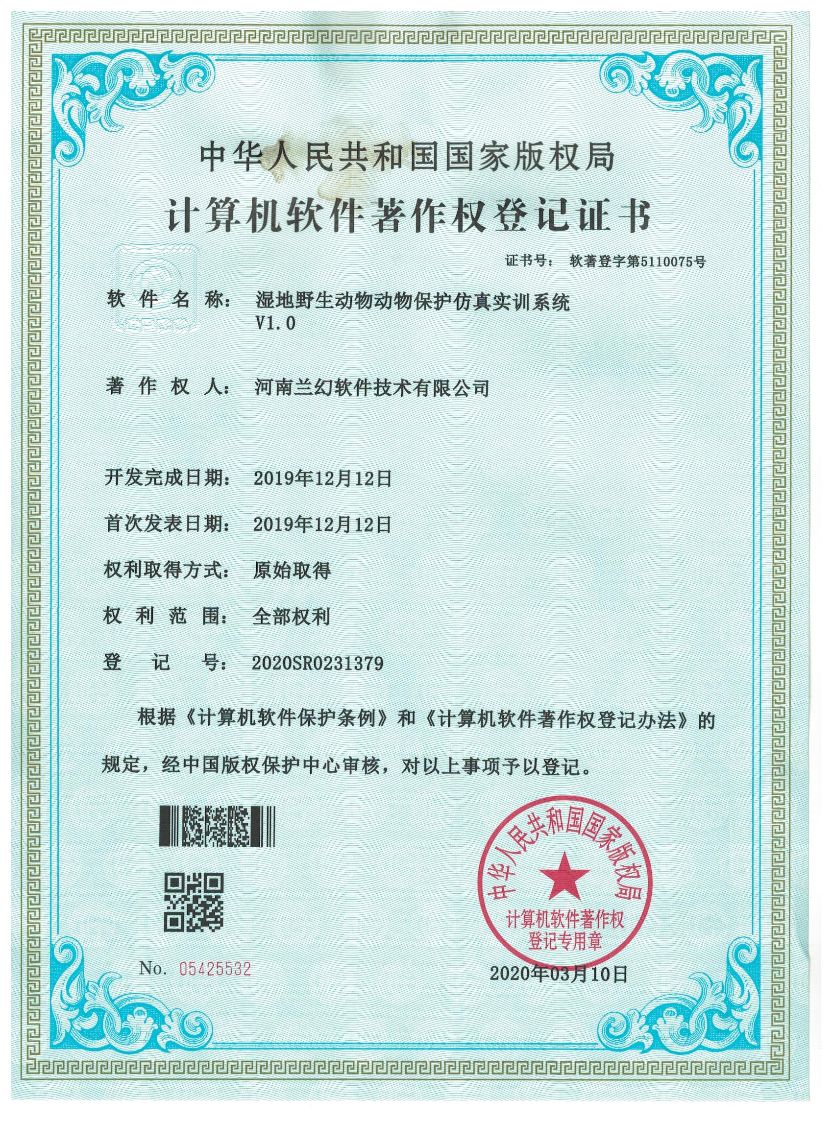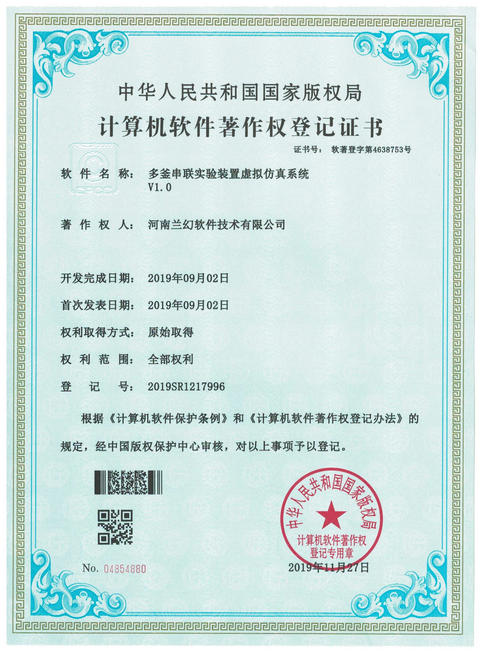 濕地野生動(dòng)物保護(hù)仿真實(shí)訓(xùn)系統(tǒng)著作權(quán)證書   雙套管傳熱實(shí)驗(yàn)裝置虛擬仿真系統(tǒng)著作權(quán)證書   多釜串聯(lián)實(shí)驗(yàn)裝置虛擬仿真系統(tǒng)著作權(quán)證書