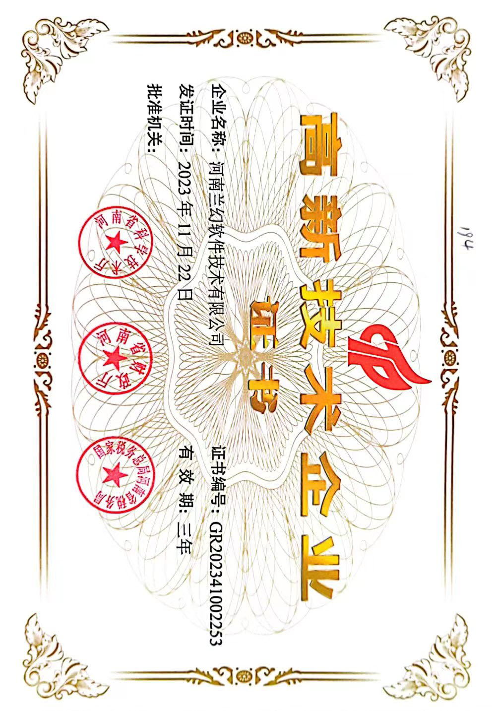 2023年再次被河南省科學(xué)技術(shù)廳、河南省財(cái)政廳、國家稅務(wù)總局河南省稅務(wù)局三方認(rèn)證“高新技術(shù)企業(yè)”。